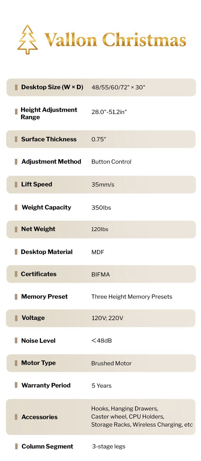 Thoughtfully crafted for modern homes and offices, it offers smart cable management, versatile modular expansions, and smooth, silent height adjustments. Experience a new level of comfort and productivity with the Vallon Christmas ergonomic standing desk that supports your health and enhances your workspace aesthetics.